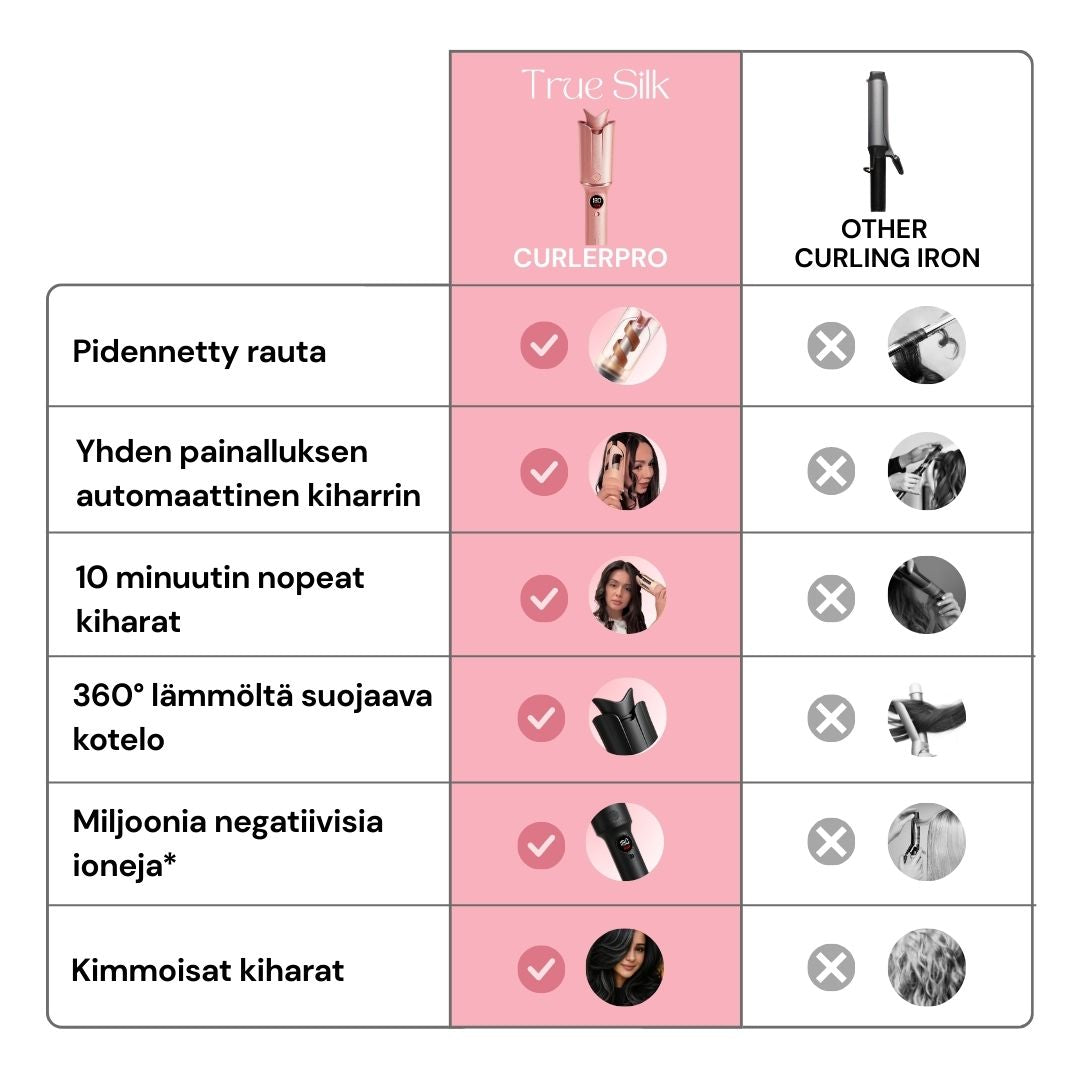 True Silk Curler Pro on suunniteltu antamaan sinulle salonkilaatuiset kiharat vaivattomasti, ilman kiinnikkeitä, takkuja tai lämpövaurioita. Säädettävillä lämpöasetuksilla, keraamisella tekniikalla ja negatiivisilla ioneilla se antaa sileät kiharat ilman pörröisyyttä, jotka kestävät koko päivän – samalla kun se suojaa hiusten kiiltoa ja terveyttä.